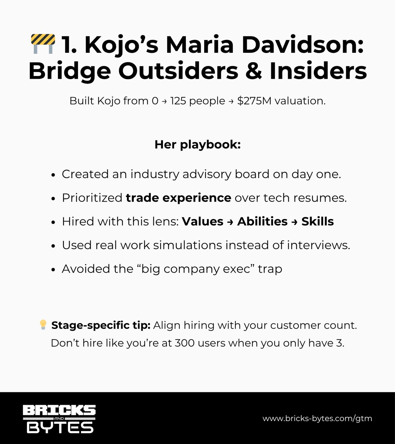 The meta-pattern in Maria's approach is understanding that different company stages require different hiring priorities. As Kojo moved through customer growth milestones (1-3 customers → 3-20 → 20-100 → 100-300 → 300+), their hiring focus evolved from finding early adopters to building repeatable processes to systematizing operations.