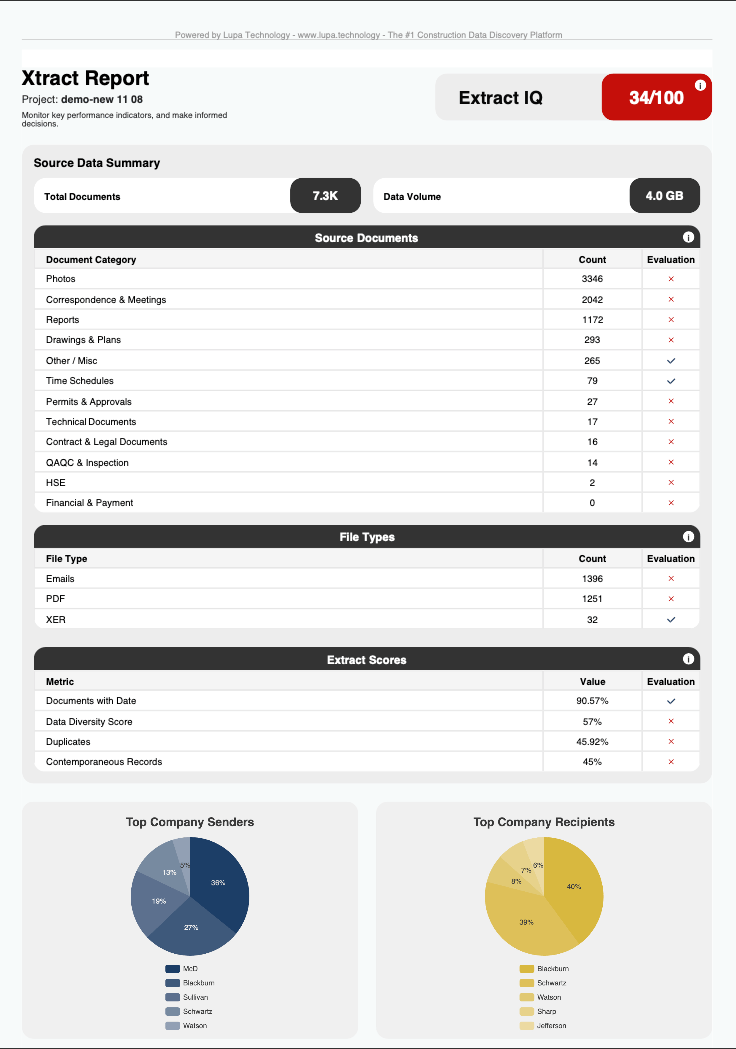 During active construction, teams use the platform to monitor project health, identify emerging issues, and make data-driven decisions. For claims and disputes, legal teams and consultants use Lupa to rapidly analyze historical project data and build evidence-based cases.